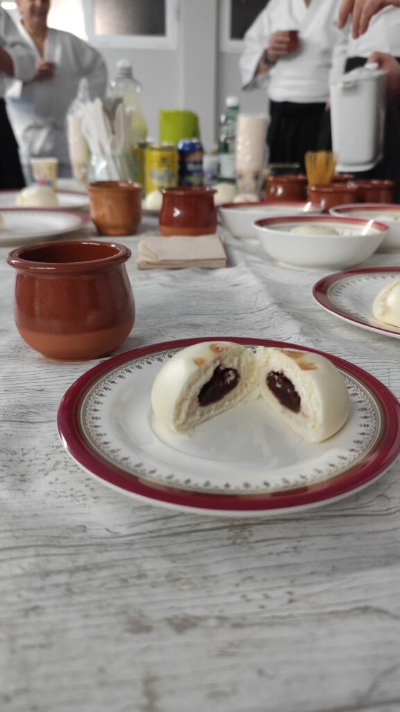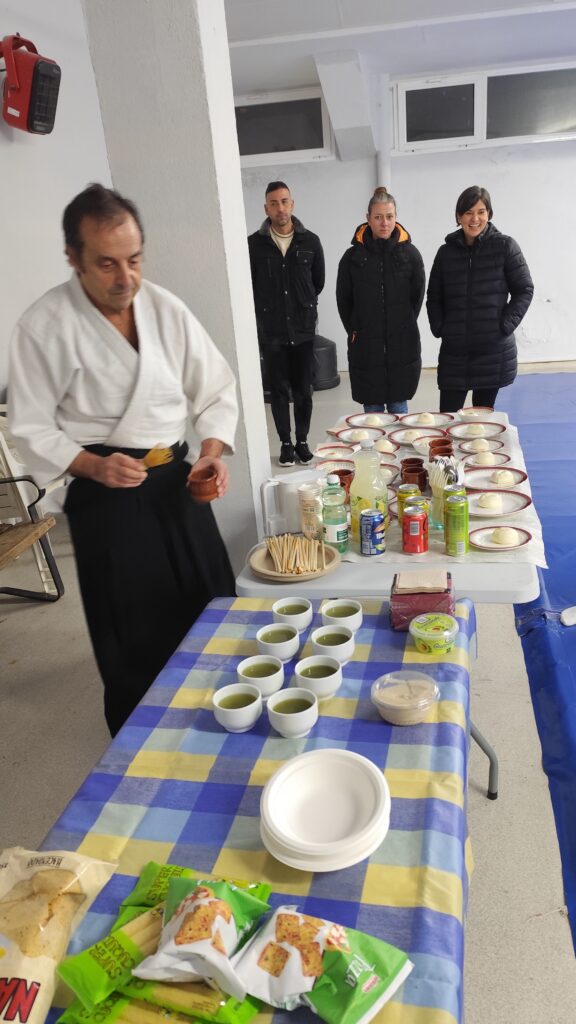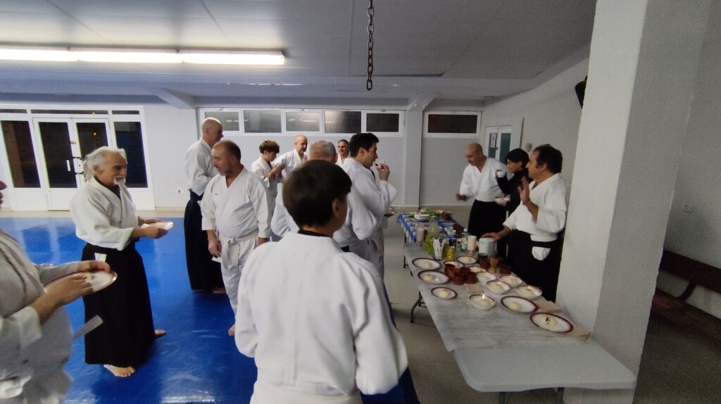 Finalmente, celebramos el Kagami Biraki, un acto en el que se inicia el nuevo año, intentando aprender de las vivencias anteriores, buenas y malas, rompiendo el mochi para aceptar lo bueno por venir, y renovando el compromiso con los valores del Aikido. Un momento de celebración y para compartir con los compañeros.